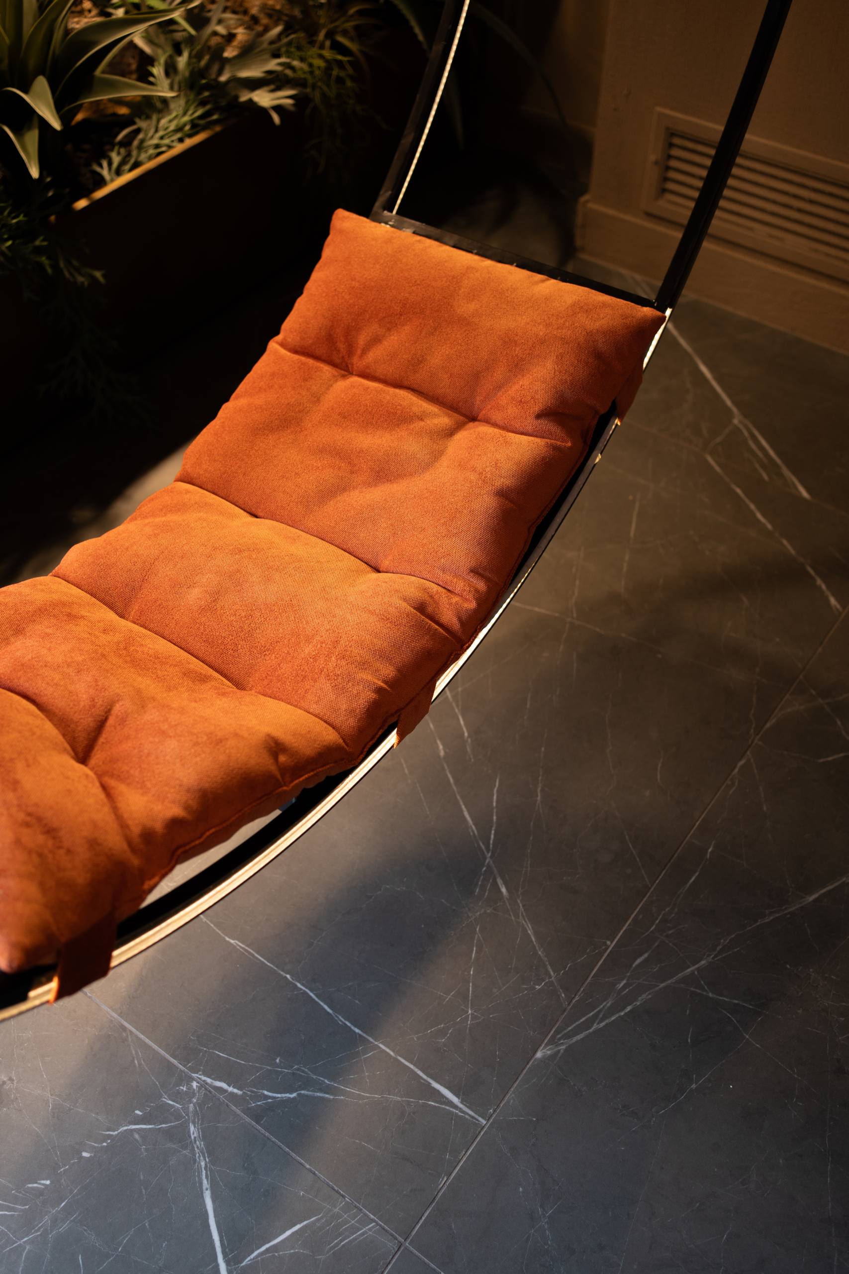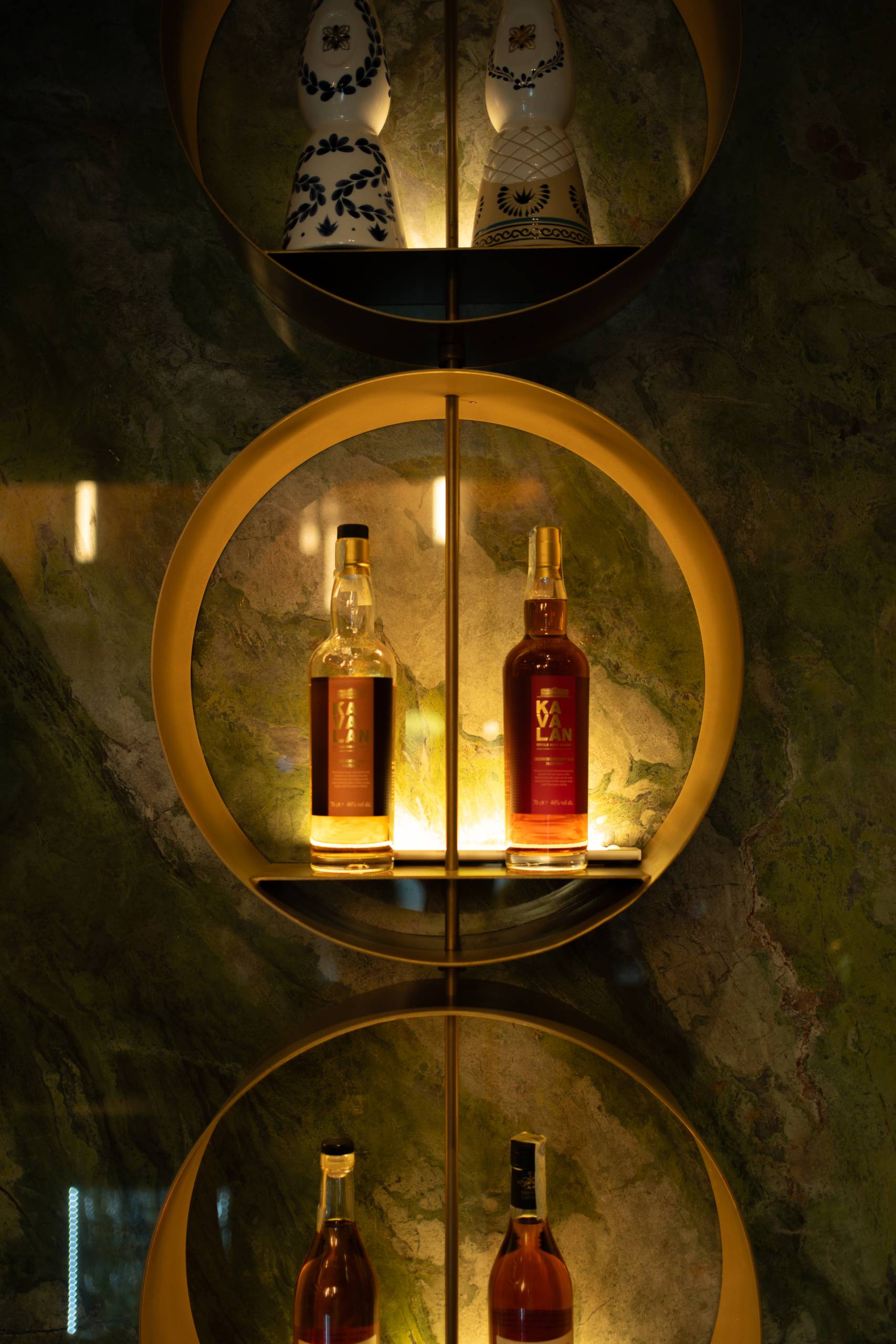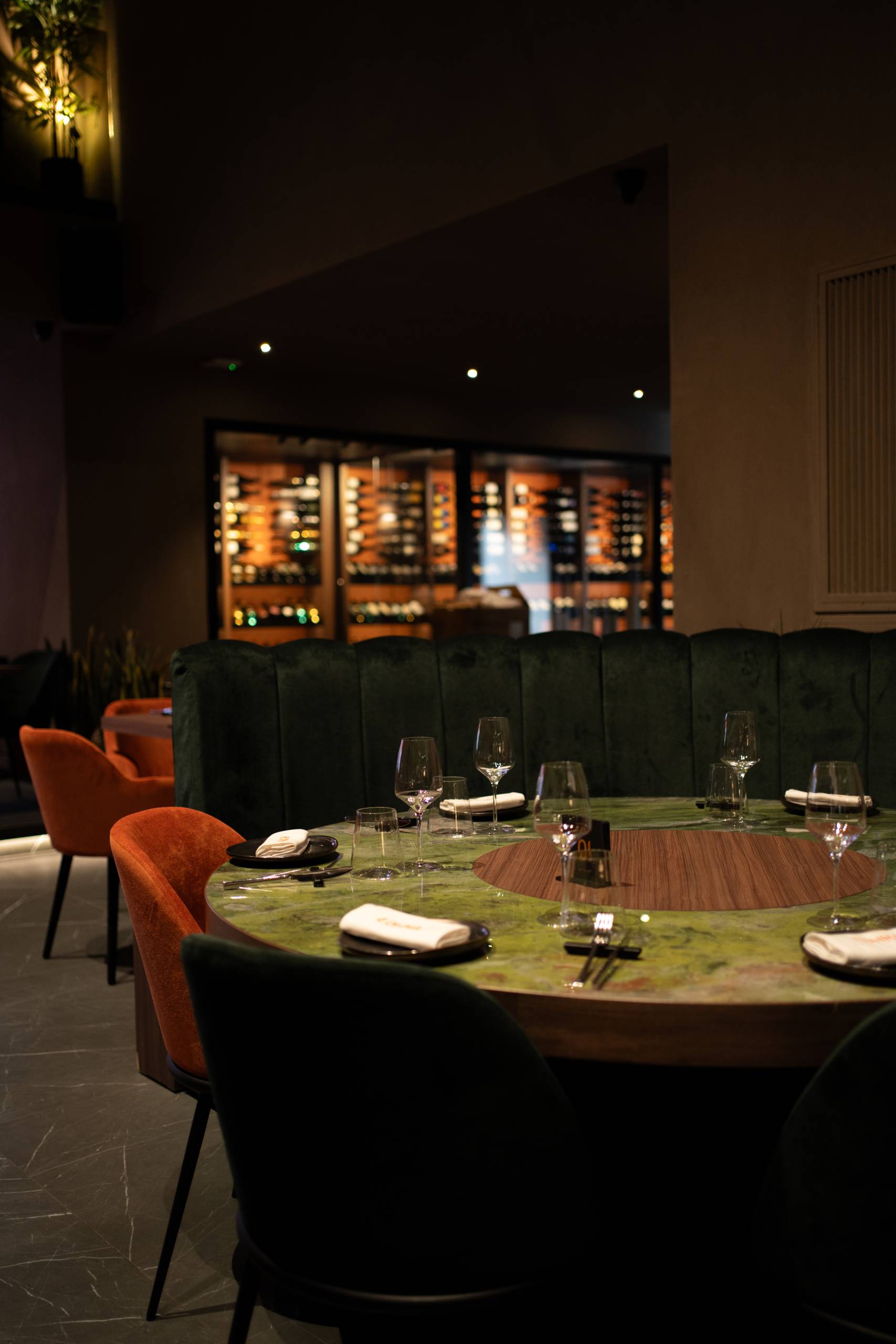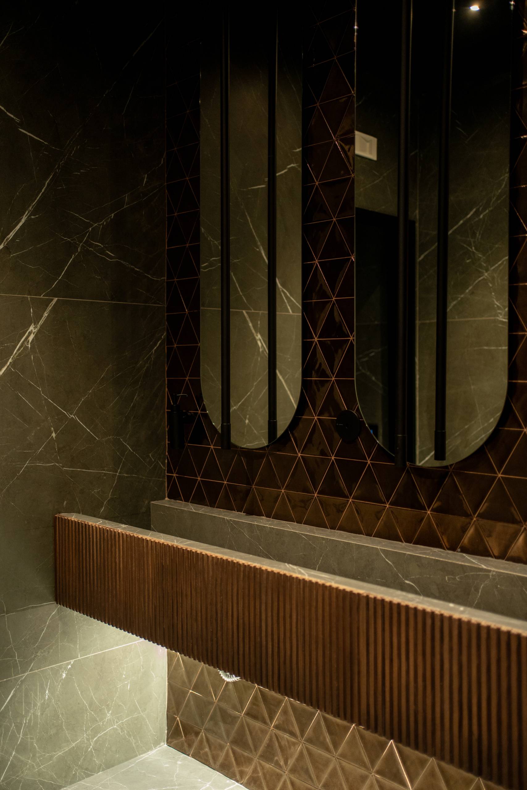 Materiali come legno, marmo e velluto si incontrano in un equilibrio di contrasti: la solidità della materia dialoga con la morbidezza delle texture, in un ambiente caratterizzato da una forte impronta identitaria.