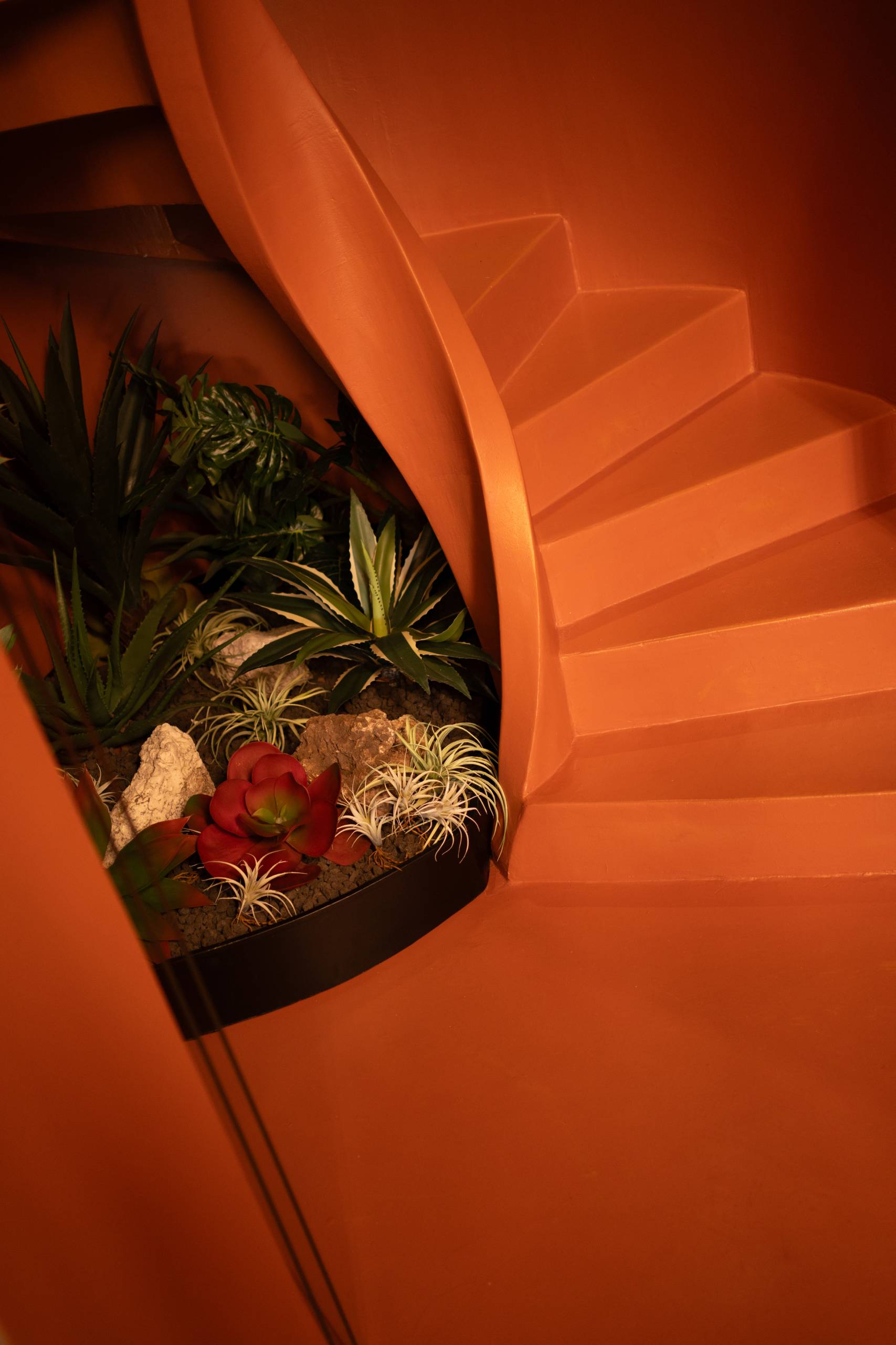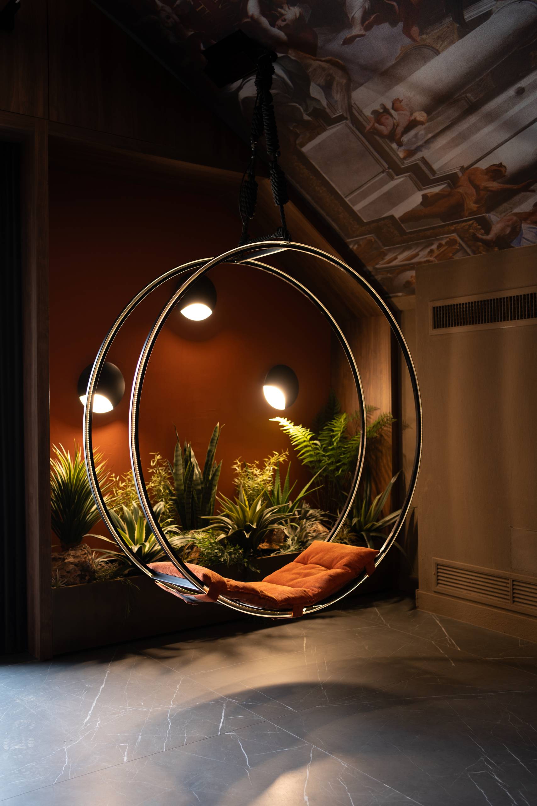 Gli ambienti si sviluppano su più livelli, con giochi di prospettiva che alternano intimità e teatralità.